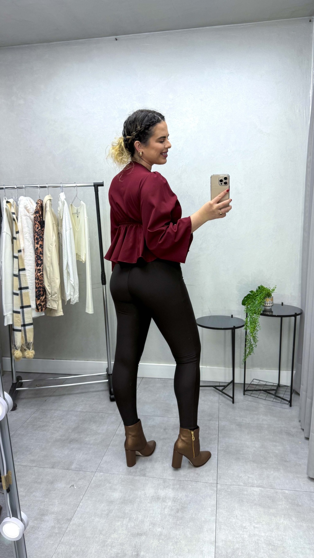 A amarração na cintura valoriza a silhueta, trazendo um caimento único e elegante. A cor marsala, intensa e versátil, combina facilmente com peças neutras ou estampadas, garantindo um visual moderno e cheio de personalidade.