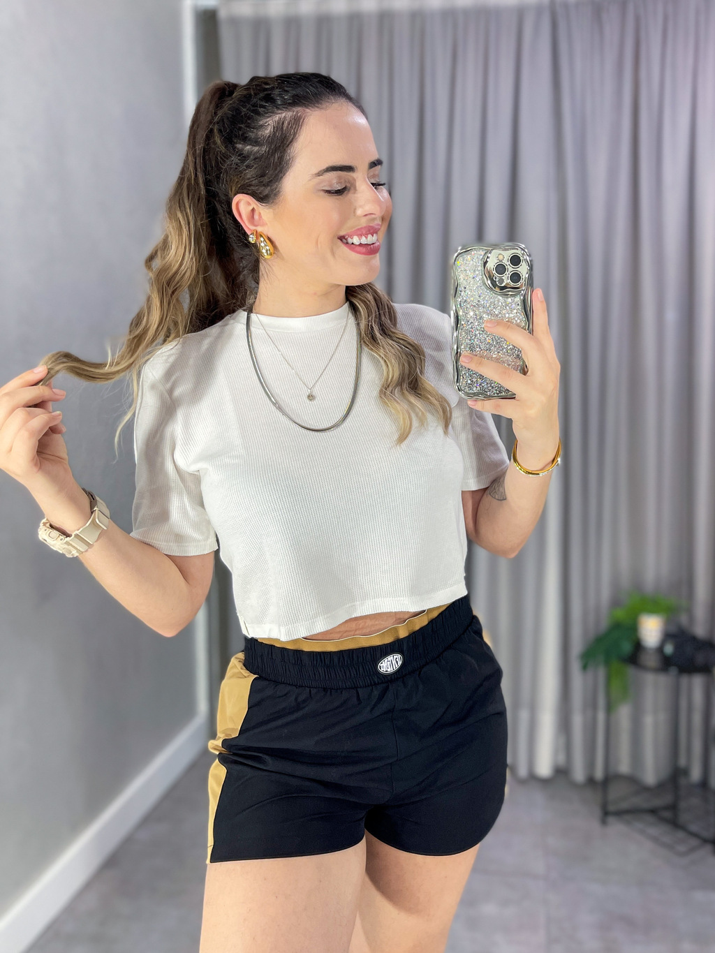 Estilo Versátil: O preto com detalhes em bege é uma combinação clássica que permite diversas combinações. Use com uma camiseta, cropped ou blusa leve e arrase nos seus passeios de fim de semana ou dia dia!